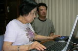 平成21年度「コミュニケーション訓練個別訪問指導」(全国盲ろう者協会主催、鹿児島県視聴覚障害者情報センター協力)の受講者【E.Nさん】の訓練風景
